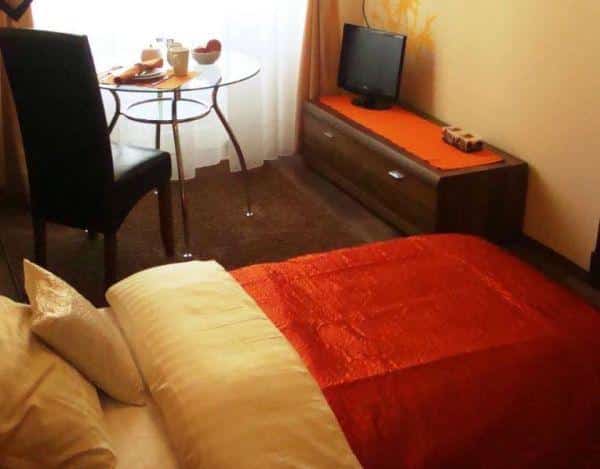 – Przestronne, nowoczesne pokoje: wyposażone w wygodne łóżka z komfortowymi materacami, satynową pościel, gustowne narzuty, skórzane krzesła, nowoczesne komody i wieszaki na odzież.