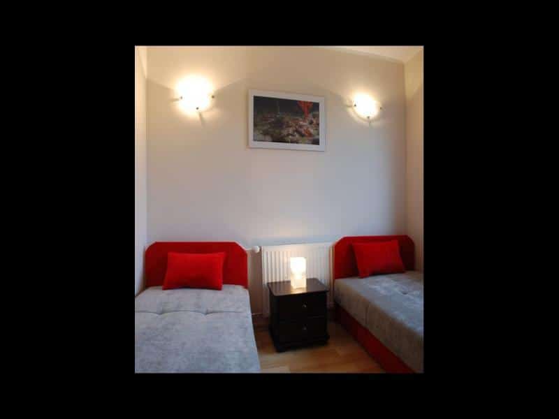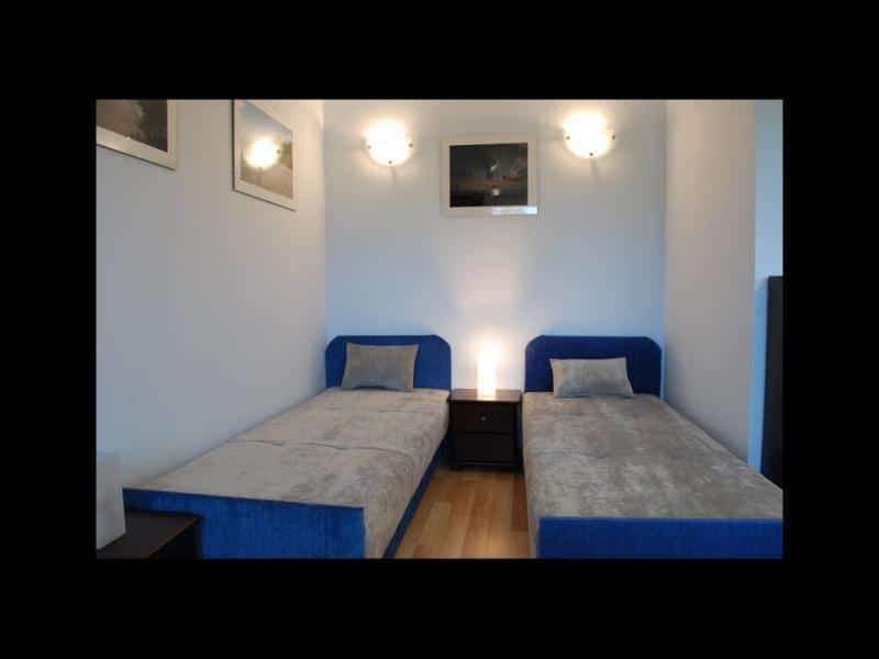 – Sypialni (7 m²) z 2 pojedynczymi łóżkami i szafką nocną.