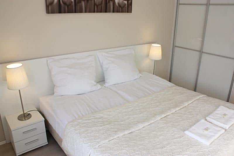 – Sypialnia: wygodne łoże hotelowe o szerokości 180 cm (możliwość złączenia lub rozdzielenia), zabudowana szafa, sejf, żelazko, deska do prasowania, możliwość dostawienia łóżeczka dziecięcego,