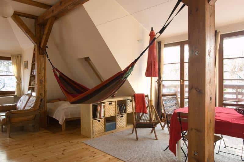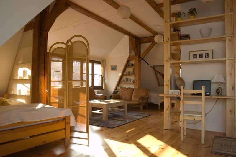 – Sypialnia na drugim poziomie (15 m²) z miejscem dla 3 osób