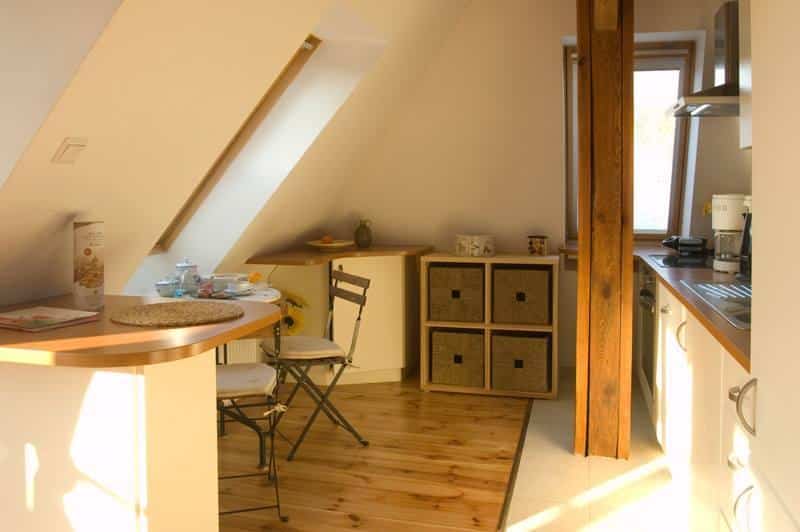 – W pełni wyposażony aneks kuchenny (6 m²) z widokiem na morze i las