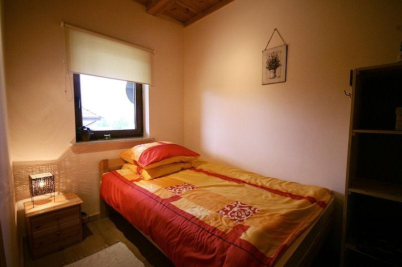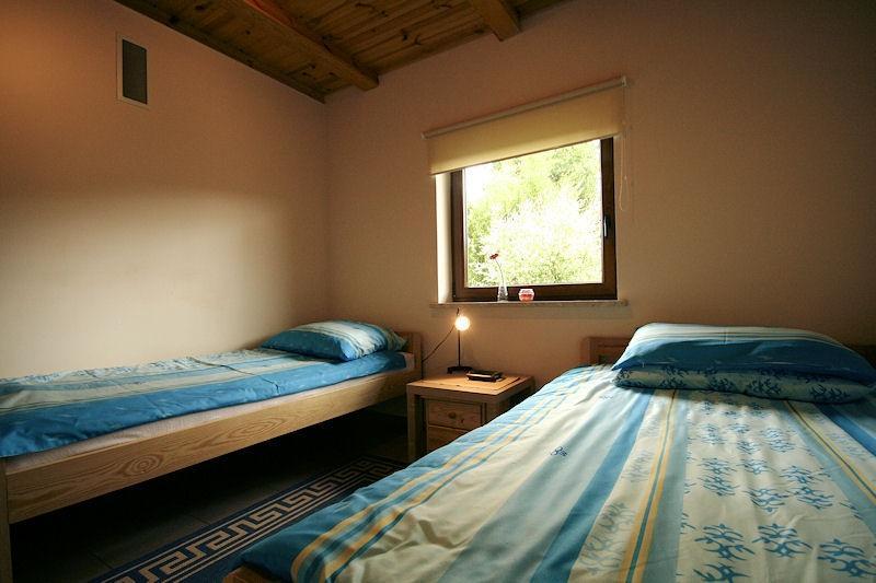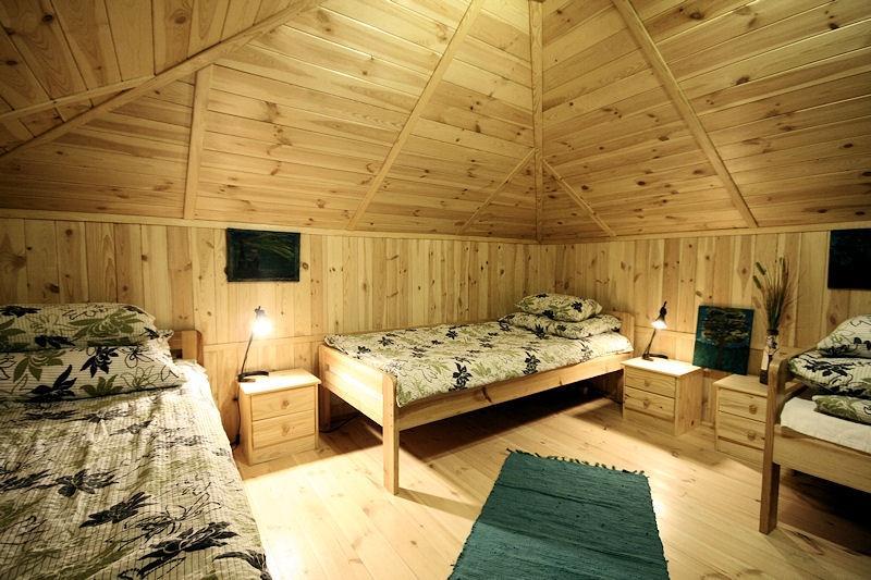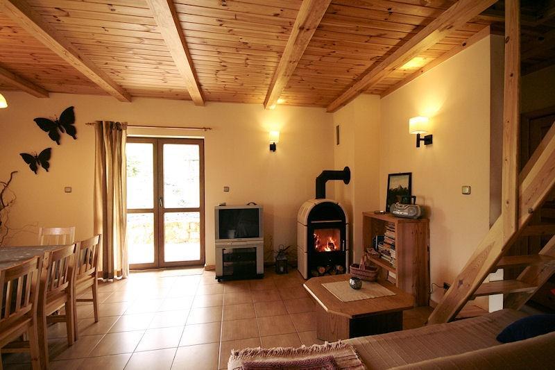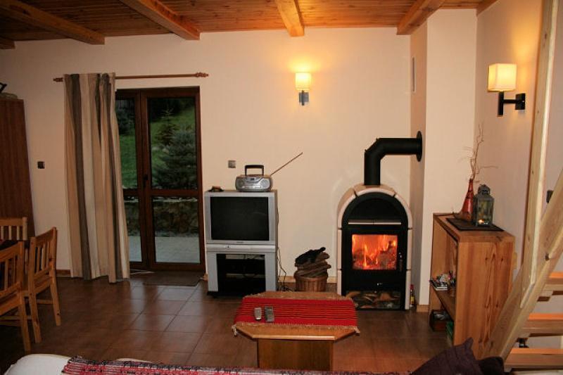 Oferujemy Państwu wyłącznie do dyspozycji gości nasz piękny sosnowy domek, który jest dostępny do wynajęcia na noclegi. Domek posiada salon, kuchnię, 2 łazienki oraz 4 pokoje, w tym 3 pokoje dla 3 osób i 1 pokój dla 2 osób. W salonie znajduje się również kanapa, która może pomieścić 2 osoby, co daje łącznie 13 miejsc noclegowych. W domku znajduje się ogrzewanie podłogowe oraz kominek, który jest widoczny w salonie.