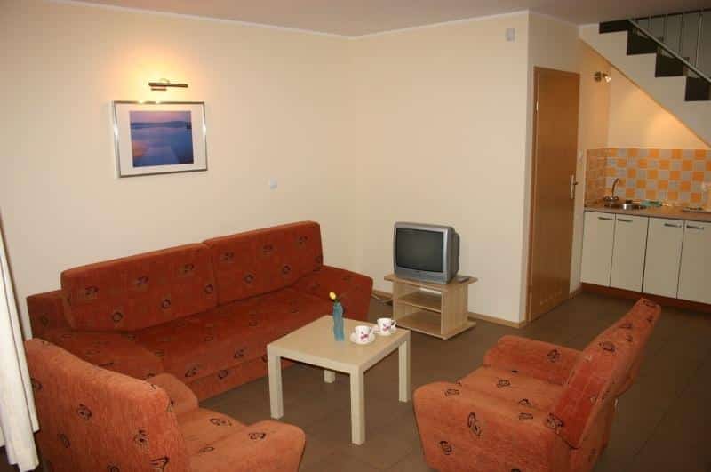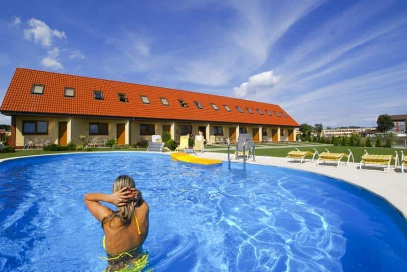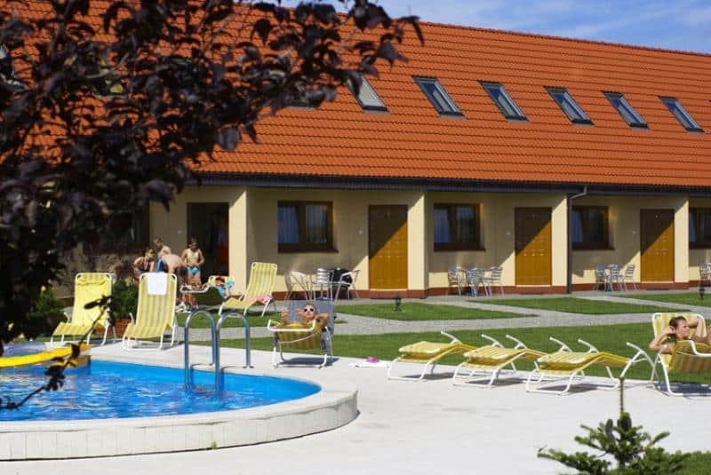 Oferujemy do dyspozycji gości murowane domki, pokoje, apartamenty oraz wyżywienie. Na terenie ośrodka znajduje się basen zewnętrzny, leżaki przy basenie, parawany na plażę, miejsce do grilla z altaną, plac zabaw dla dzieci z huśtawką i ślizgawką, wypożyczalnia rowerów, plac do gry w piłkę, paletki do badmintona, taras letni przed kawiarenką oraz WiFi.