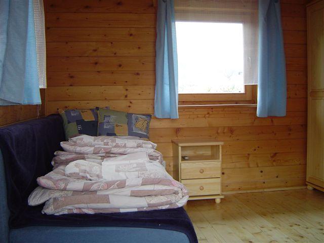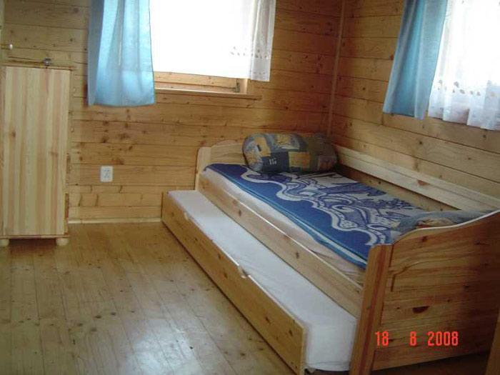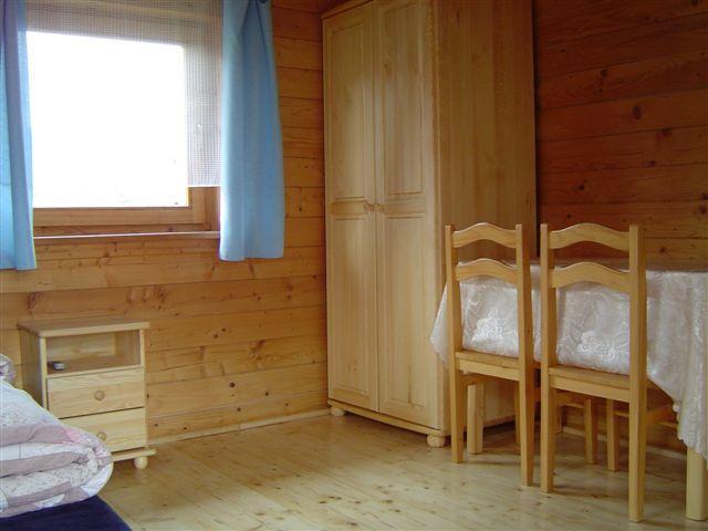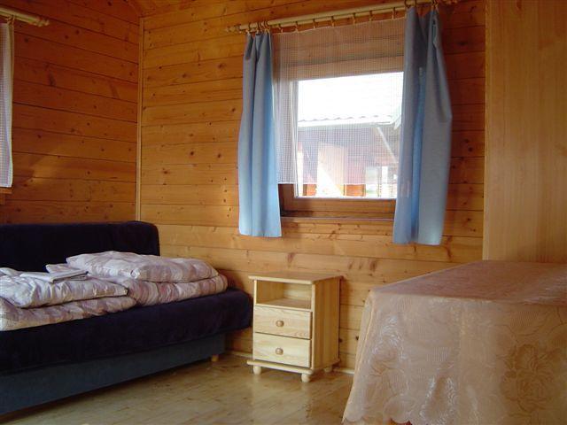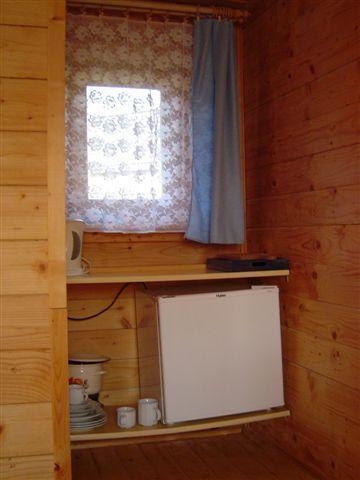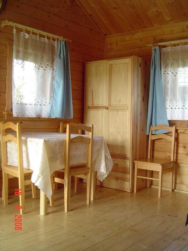 – **Domek 1**: Dwupokojowy, z kuchnią, łazienką i dwoma telewizorami. Większy pokój pełni rolę salonu z jadalnym stołem i łóżkiem dla dwóch osób. Mniejszy pokój wyposażony jest w dwa łóżka, z możliwością wysunięcia jednego spod drugiego.