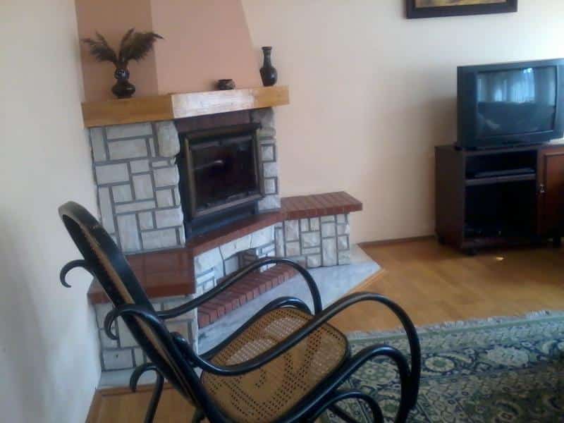 – Przestronny salon z dużym narożnikiem, który można rozłożyć, dwoma fotelami, czterema pufami, fotelem bujanym, kominkiem, komodą i telewizorem,