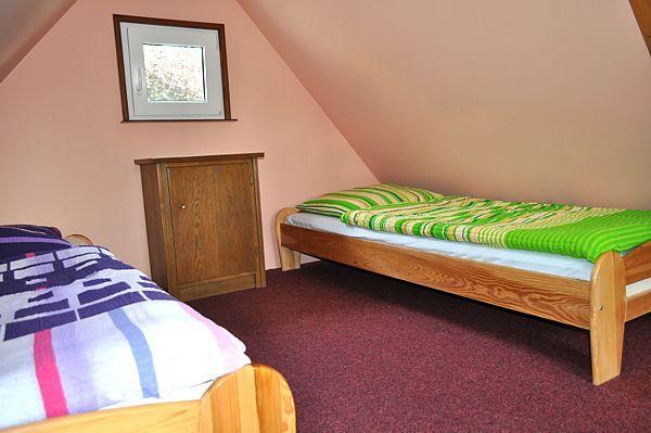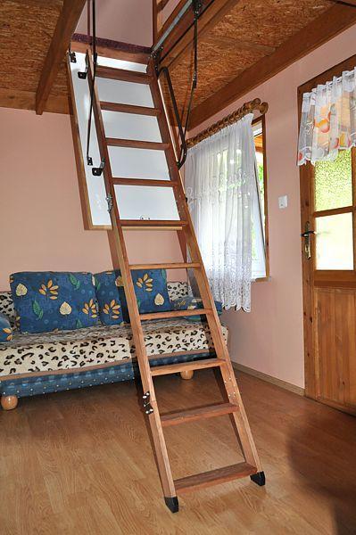 Domek oferuje komfortowe warunki dla 4 osób, z dwiema sypialniami – jedną na dole i drugą na górze. W środku znajdziecie: