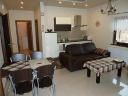 – salonu z kominkiem, TV-SAT, stołem, krzesłami i rozkładaną kanapą