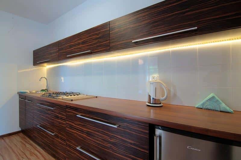 – W pełni wyposażonego aneksu kuchennego z lodówką, płytą gazową, zlewozmywakiem, stołem i krzesłami,