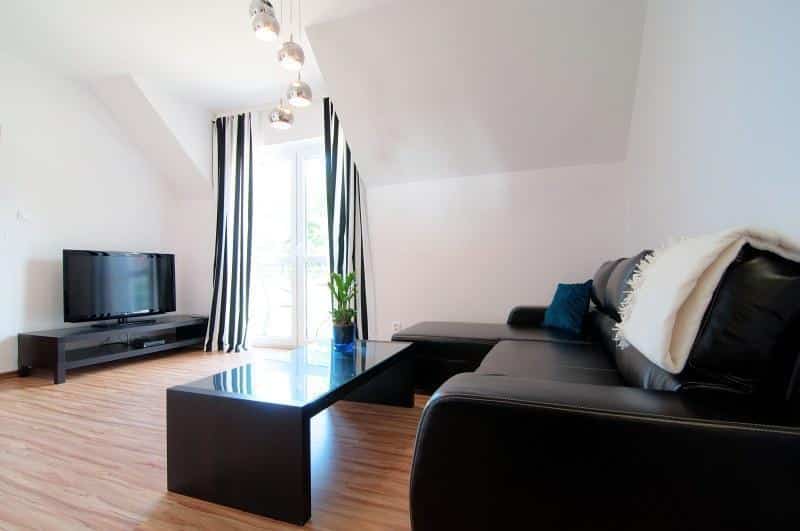 – Salonu z aneksem kuchennym, w którym znajduje się narożnik z funkcją spania, telewizor LCD, telewizja cyfrowa oraz stolik kawowy,
