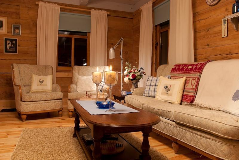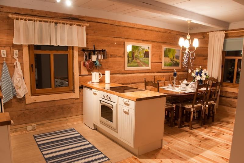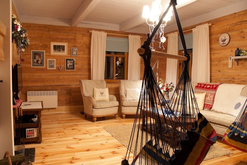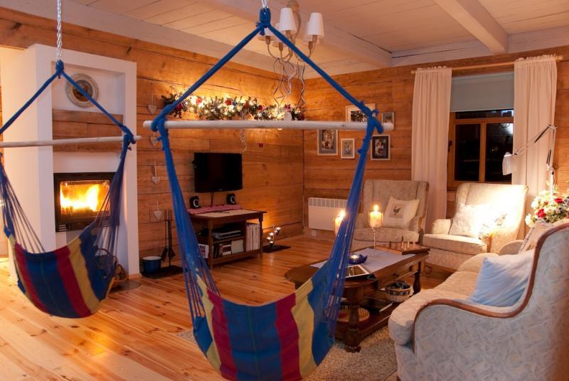 Dom o powierzchni 120 m² oferuje przestronny parter z dużym salonem, w którym znajdziecie kominek, wygodną kanapę, fotele i hamaki. W jadalni czeka na Was duży stół, idealny do wspólnych posiłków. W pełni wyposażona kuchnia oraz łazienka z prysznicem z hydromasażem dopełniają komfortu tego miejsca. Do dyspozycji gości jest również przytulny taras.