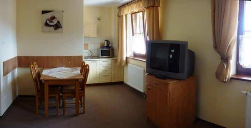 Każdy pokój posiada własną łazienkę, co zapewnia wygodę i prywatność. Dodatkowo, nasi goście mogą korzystać z ogólnodostępnego aneksu kuchennego, wyposażonego w lodówkę, mikrofalówkę, toster, maszynkę do gotowania jajek oraz naczynia. Istnieje również możliwość zamówienia wyżywienia, a nasze urozmaicone śniadania w formie stołu szwedzkiego na pewno zadowolą każde podniebienie.