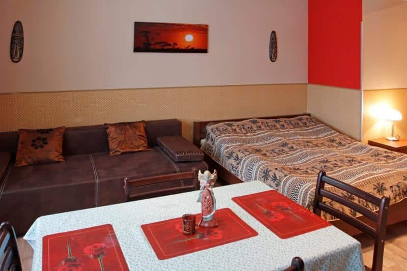 – Pokoje dla 4-6 osób w stylu azjatyckim i afrykańskim, z dwoma podwójnymi łóżkami, łazienką z prysznicem, telewizorem i internetem.