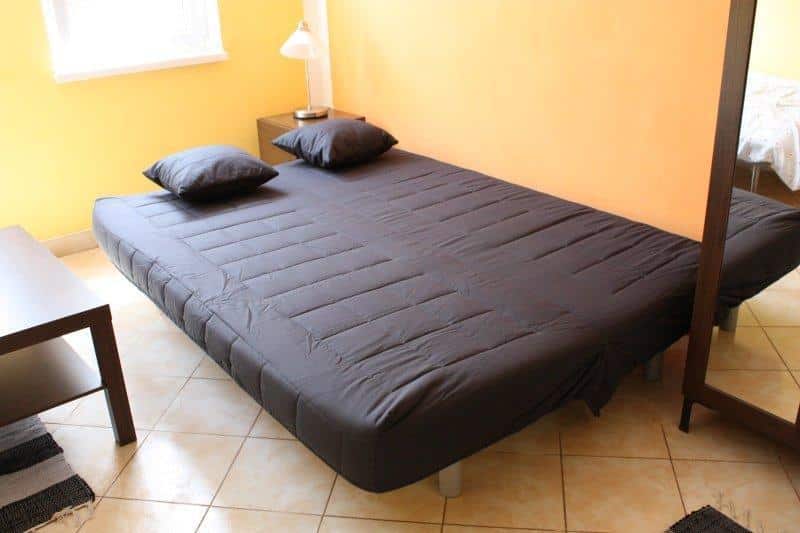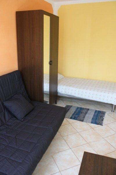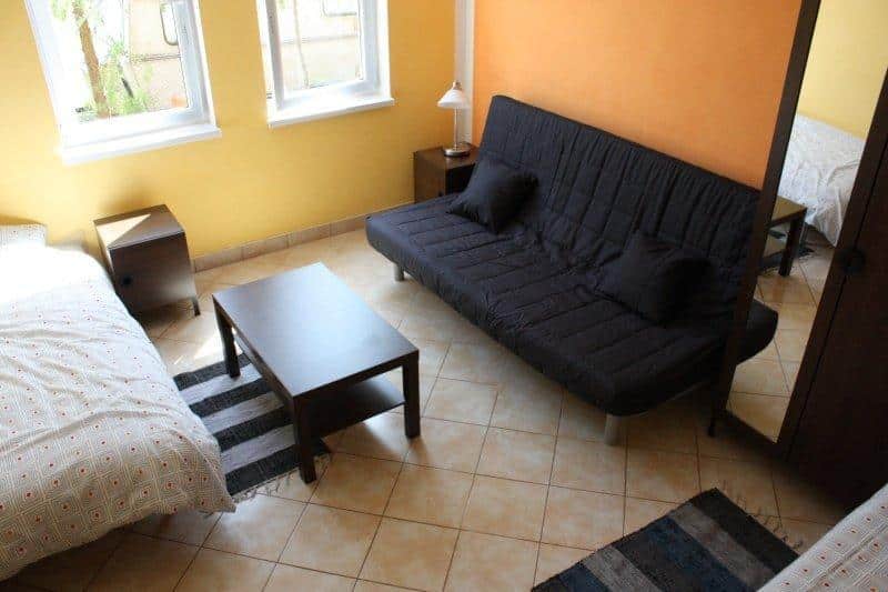 – Salon/sypialnia: dwa jednoosobowe łóżka, dwuosobowa kanapa, telewizor, szafa i komoda. Wnętrza są urządzone w ciepłych barwach, co sprzyja relaksowi.