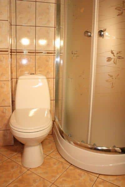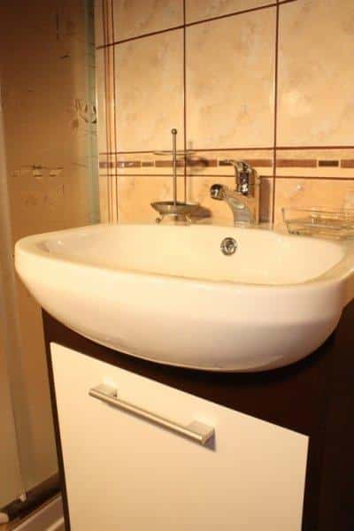 – Łazienka: natrysk z ciągłym dostępem do ciepłej wody, wykończona w eleganckich beżowo-brązowych odcieniach.