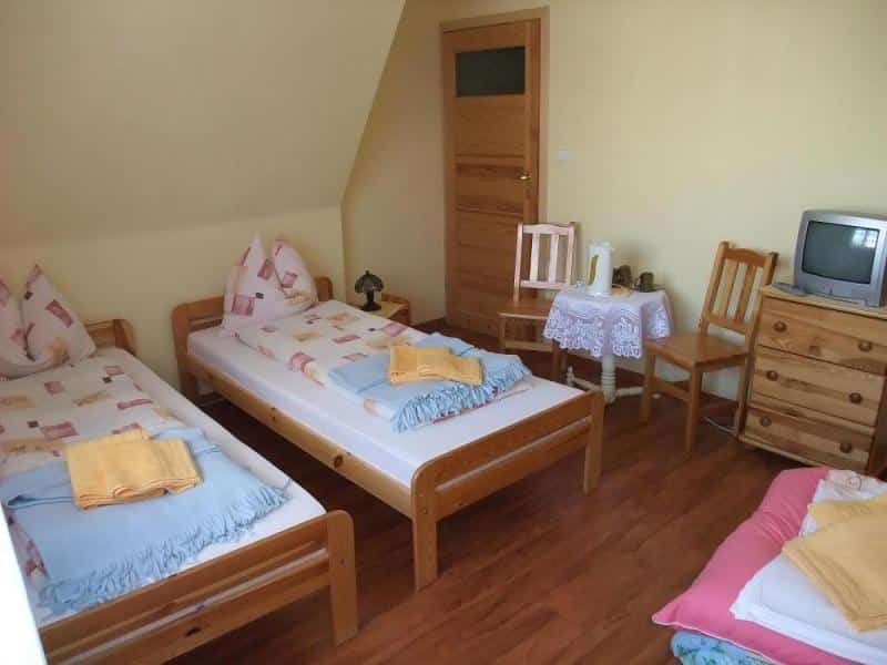 Oferujemy przytulne pokoje dwu- i trzyosobowe, w tym z łóżkami małżeńskimi, wyposażone w telewizor, internet oraz łazienkę. Na miejscu dostępna jest również stołówka, gdzie można podziwiać galerię obrazów znanego malarza Ślusarskiego.
