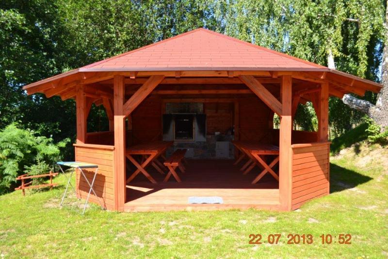 Teren posiadłości jest ogrodzony i monitorowany, oferując duży parking. Wschodnia część działki to boisko do siatkówki z możliwością rozstawienia bramek do piłki nożnej oraz plac zabaw dla dzieci. Można tu również zorganizować ognisko lub spędzić wieczór w chacie grillowej, korzystając z grilla lub wędzarni. Dla odważnych przygotowaliśmy możliwość samodzielnego pieczenia chleba.