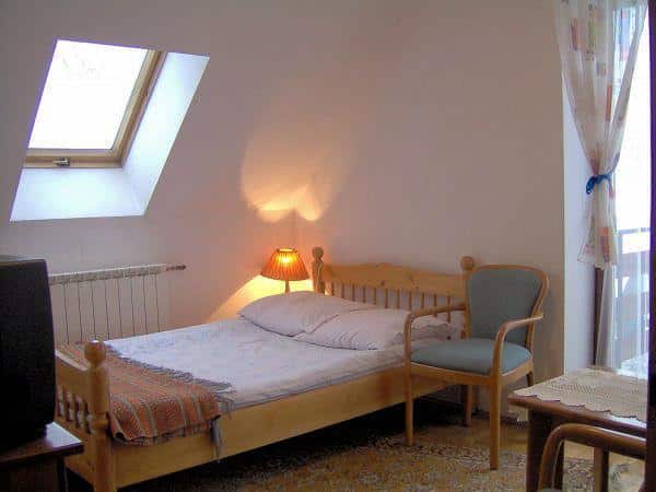 Nasze pokoje są komfortowe i przytulne. Oferujemy apartament dla dwóch osób z łazienką, balkonem oraz telewizorem i radiem. Dodatkowo, mamy pokój dwuosobowy z balkonem, który ma wspólną łazienkę z pokojem trzyosobowym. Wszystkie pokoje są gustownie urządzone, a ściany wyłożone drewnem, co nadaje im wyjątkowego charakteru.