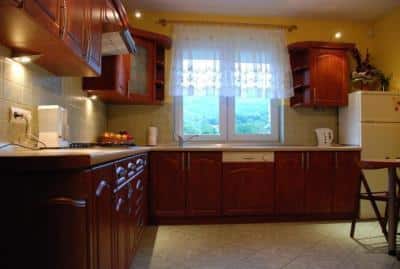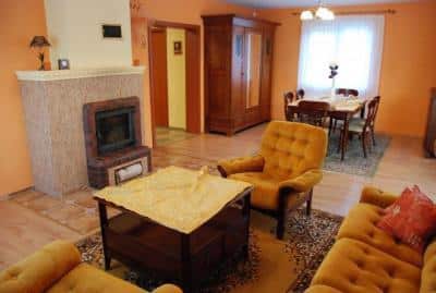 Nasz całoroczny dom o powierzchni 230 m² oferuje komfortowe warunki pobytu. W przestronnym salonie (45 m²) znajdziecie telewizor LCD 32”, odtwarzacz DVD oraz przytulny kominek. Duża, w pełni wyposażona kuchnia z kuchnią kaflową i piecem chlebowym pozwoli na przygotowanie domowych posiłków.