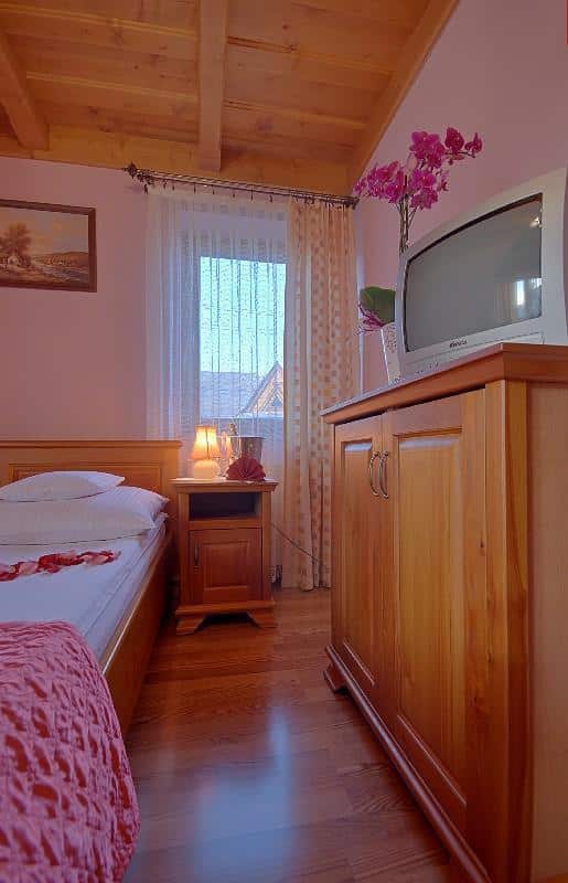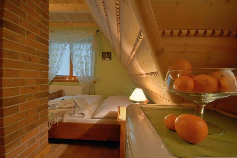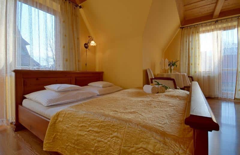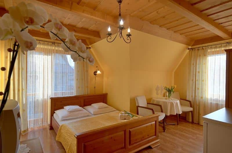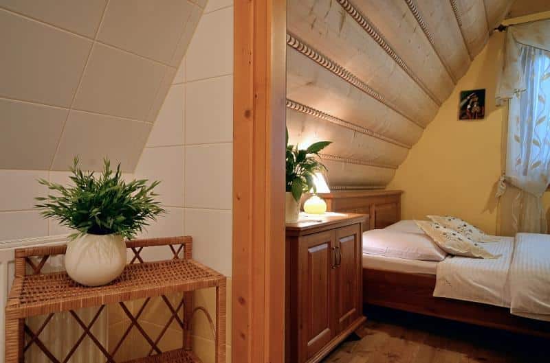 Pokoje na drugim piętrze, czyli poddasze, wprowadzają w klimat Podhala dzięki skosom i naturalnemu drewnu. Znajdziesz tu: