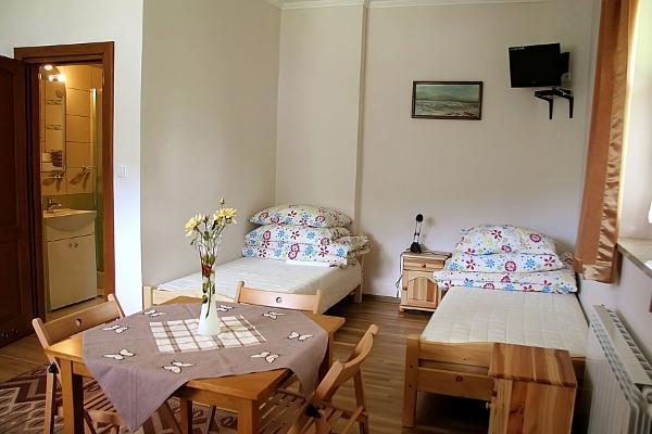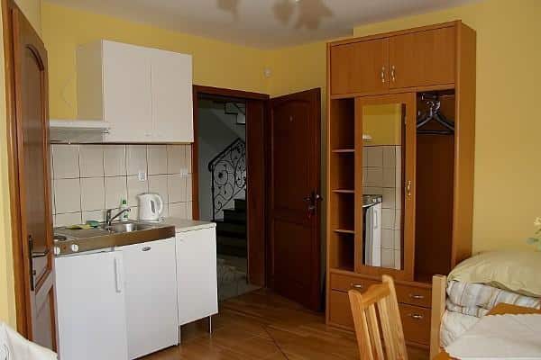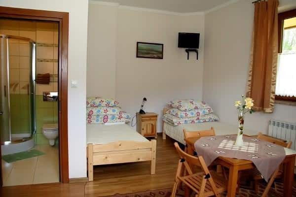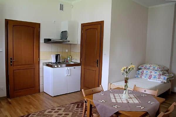Dla większej wygody, posiadamy również apartamenty z aneksem kuchennym. Na terenie pensjonatu znajduje się wspólna, w pełni wyposażona kuchnia oraz żelazko i deska do prasowania.