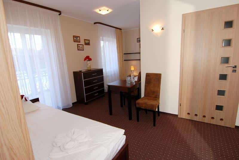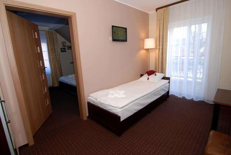 – 7 pokoi dwuosobowych, w tym dwa z wewnętrznymi drzwiami i wspólną łazienką, tworzące mini apartament,