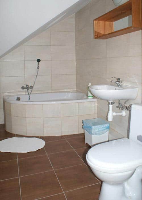 – Dużą łazienkę z prysznicem lub wanną, umywalką, toaletą, lustrem, suszarką do włosów oraz ręcznikami