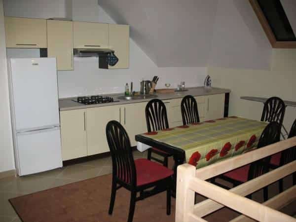 – **Kuchnia:** Duży hall z aneksem kuchennym dla gości korzystających z pokoi.