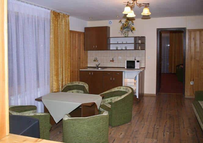 – Apartamenty: Przestronne, mieszczące od 4 do 5 osób, wyposażone w aneks kuchenny z lodówką i mikrofalówką, co umożliwia samodzielne przygotowywanie posiłków.