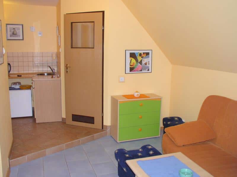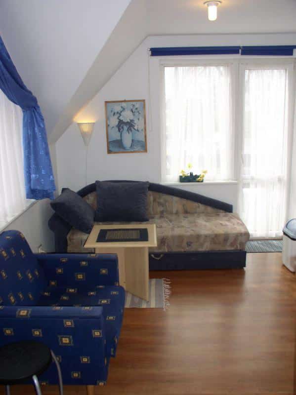 – **Pokój dwuosobowy z możliwością dostawki** z aneksem kuchennym, łazienką i balkonem.