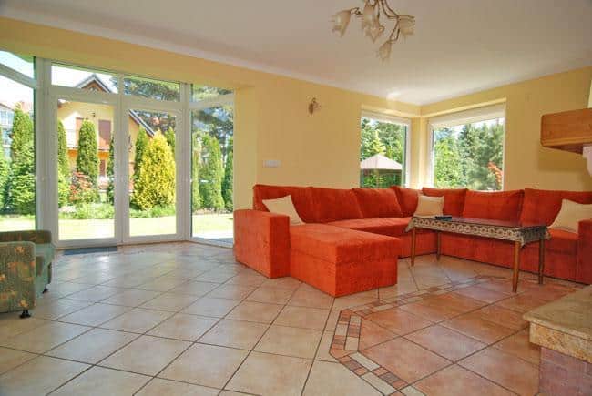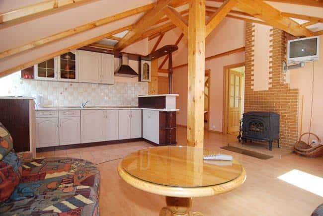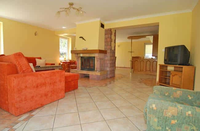 – Przestronny salon (60 m²) z kominkiem i aneksem kuchennym