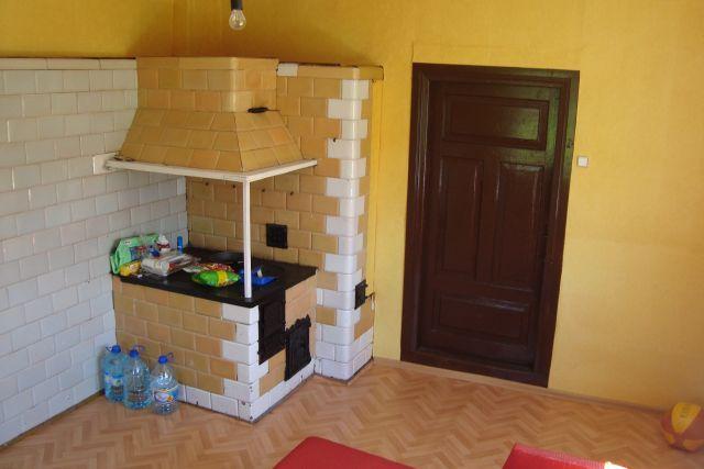 – Pokój dla czterech osób z dwoma podwójnymi łóżkami, lodówką i stylowym, dekoracyjnym piecem kaflowym.