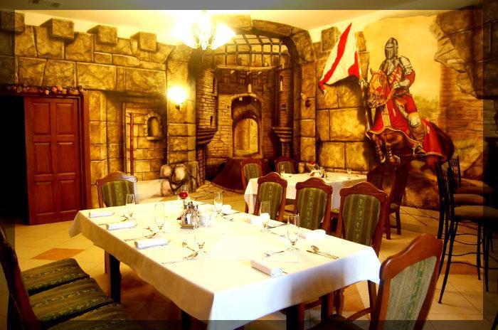 – Sala Rycerska: kameralna przestrzeń z malowidłami nawiązującymi do epoki Średniowiecza, doskonała na spotkania towarzyskie, filiżankę kawy, kieliszek wina czy smaczny deser.
